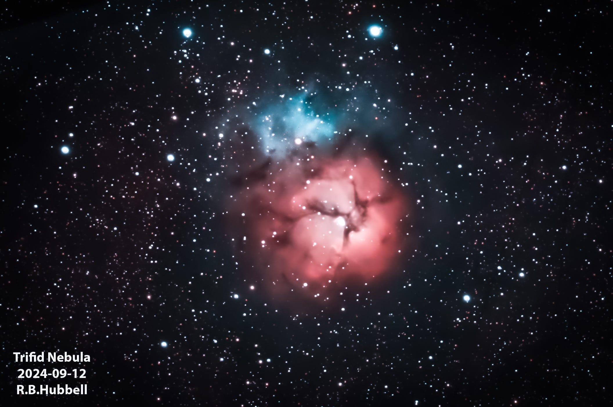 It is still overcast and drizzly in Los Angeles, so I cannot set my telescope outside. I republish below an image I captured in September. The Trifid Nebula is 4,100 light-years from Earth and 21 light-years in radius.