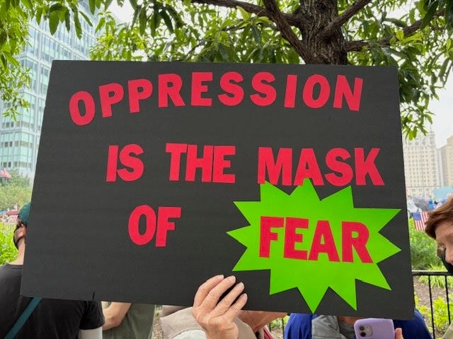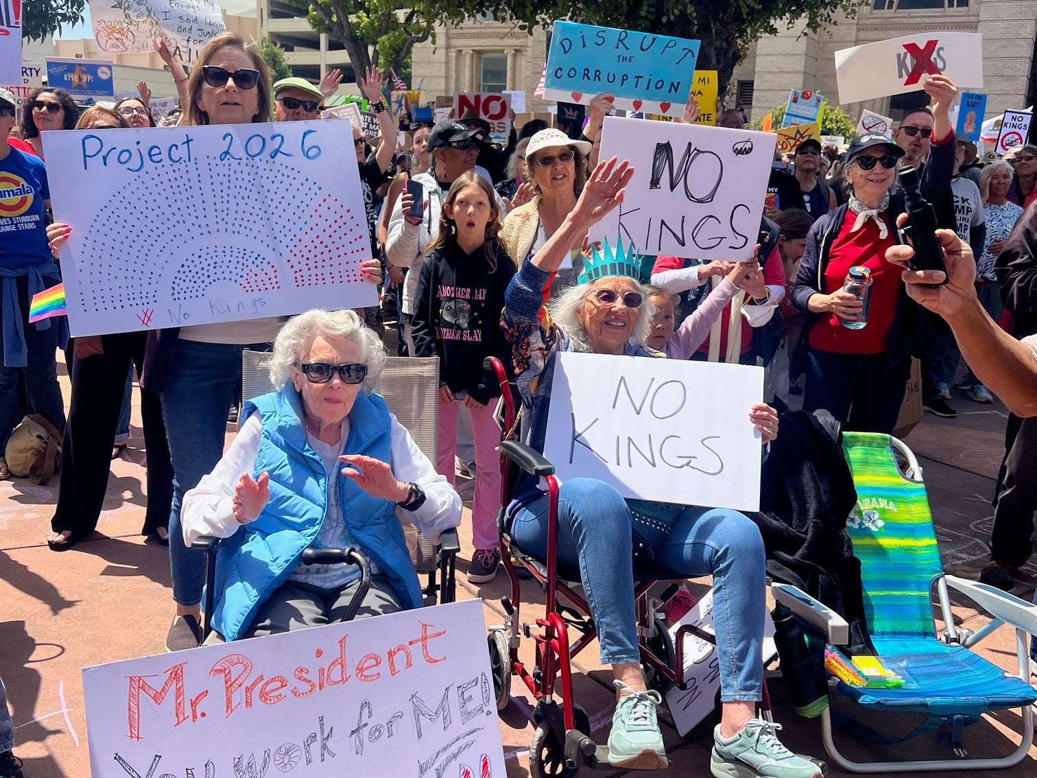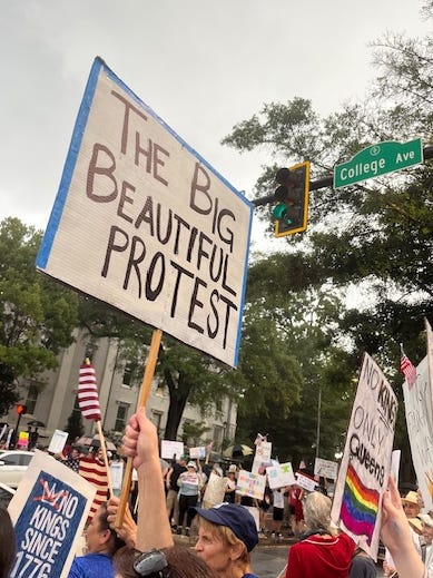I received reports from Americans abroad (and friends of America) who rallied in the UK, Mexico, Portugal, Germany, and at sea in international waters. I received a photo of a reader who had quadruple bypass surgery on Friday and was holding a “No Kings” sign in his hospital bed on Saturday. I received photos of seniors in wheelchairs in care facilities and at protests. Friends sent photos of young children and teens accompanying them to protests. Dozens of readers reported that they attended their first protest ever on No Kings Day, and many were overcome with emotions of joy and relief.
