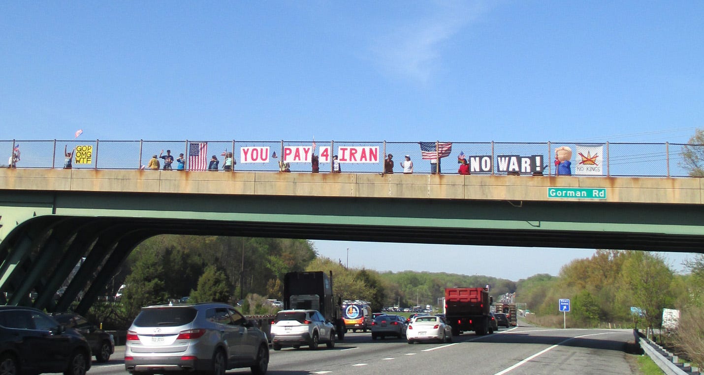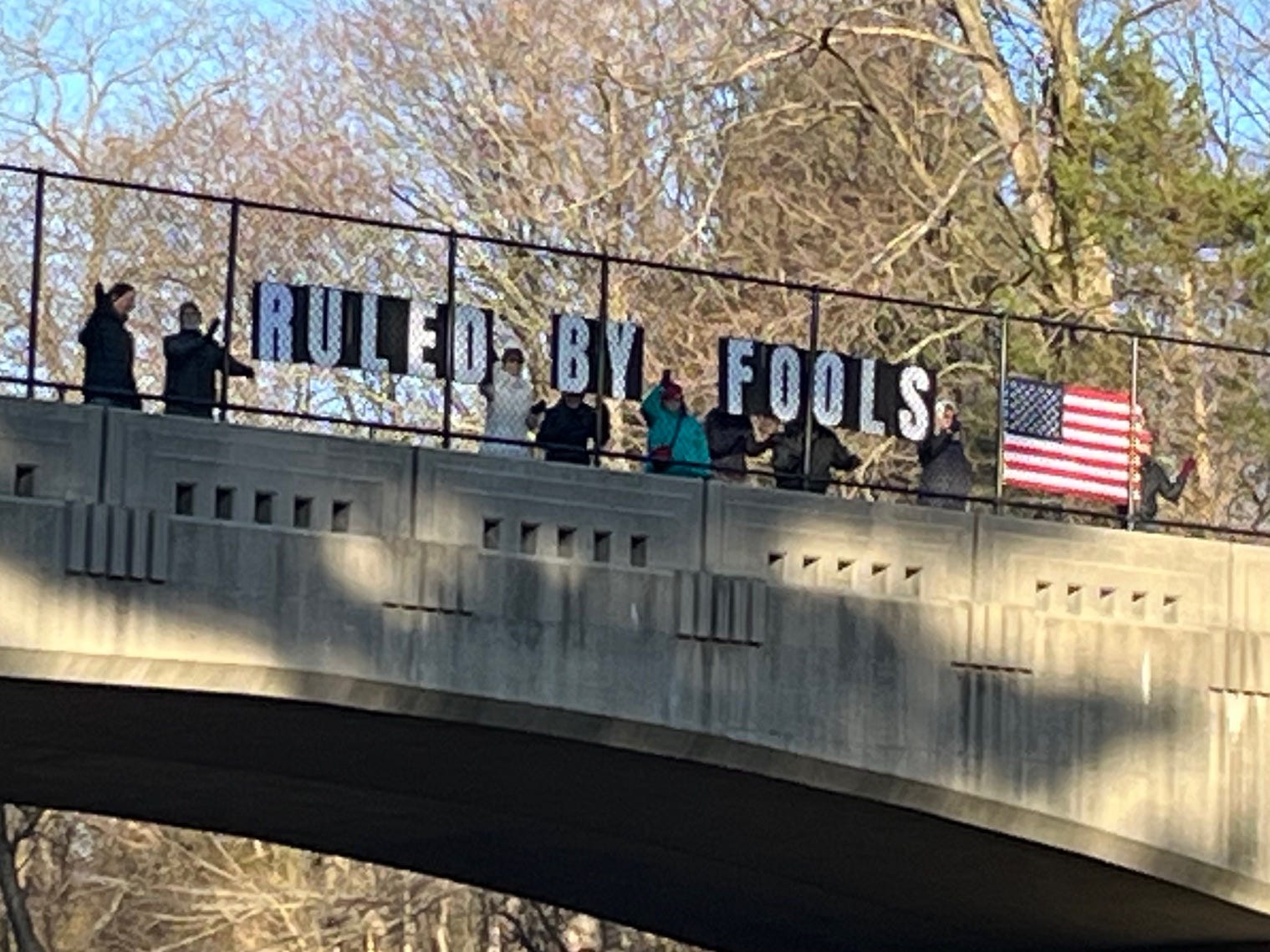 Lots of honks & waves, very few fingers for both messages. 4/9/26 Merritt Parkway Burr Street overpass, Fairfield, CT. “Ruled By Fools”