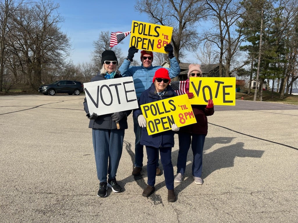 Our small village of Spring Green (which voted for Chris Taylor 458 - 111) had three one-hour shifts of folks out on the major highway reminding people to vote. Here's a photo of the 4 - 5 p.m. shift.