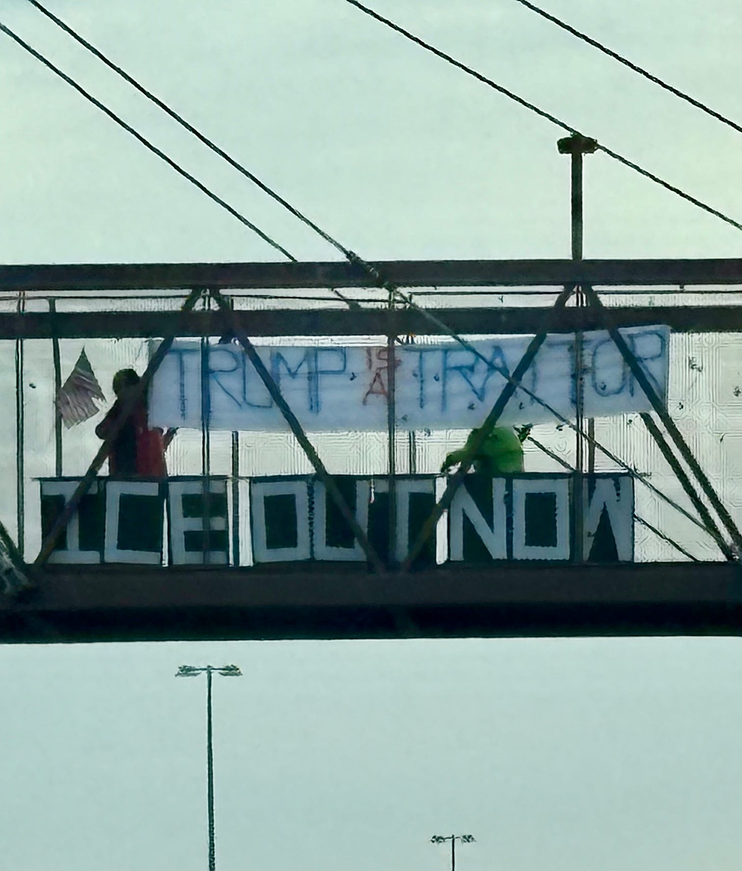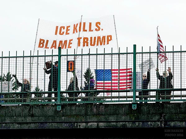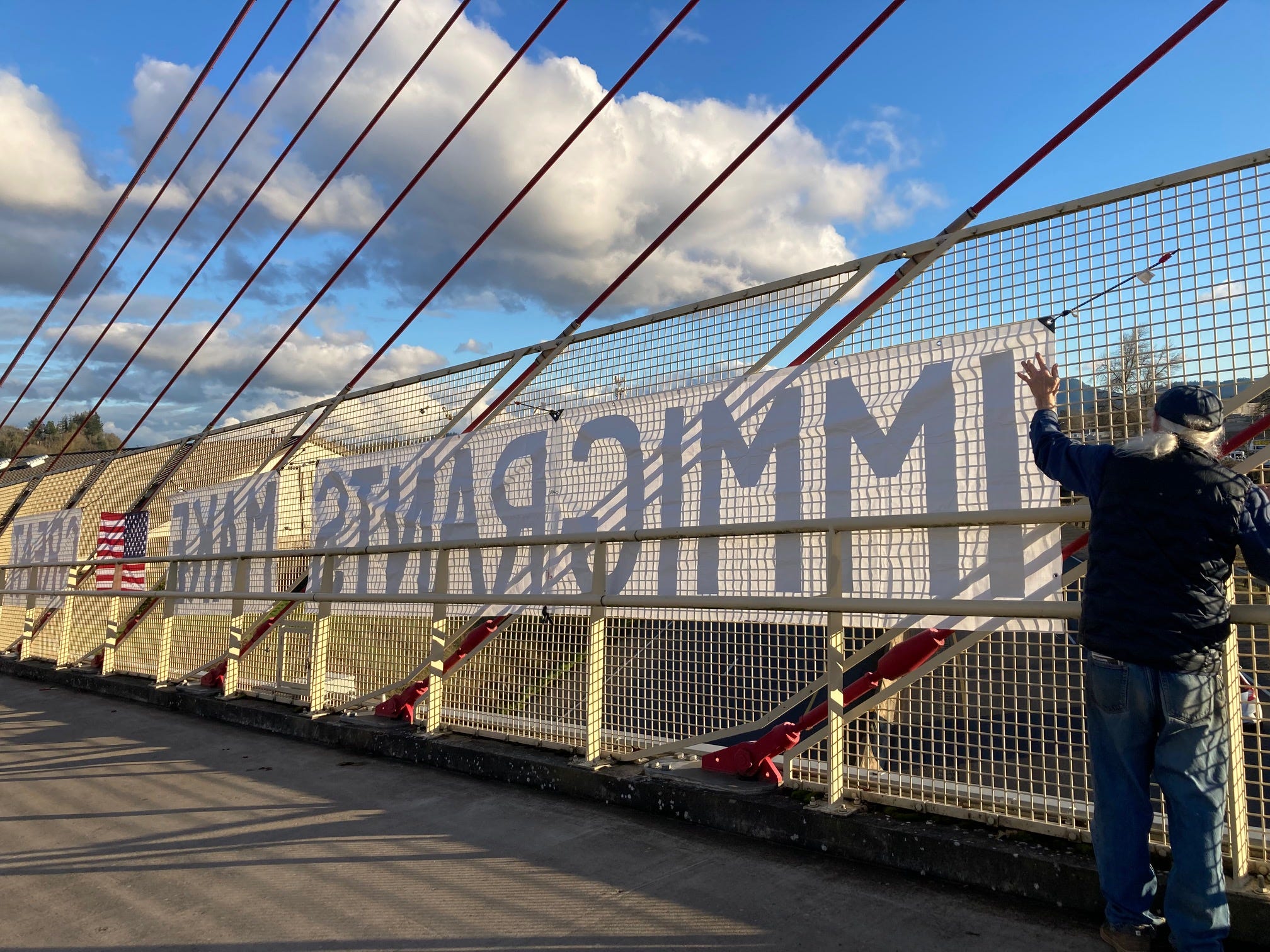 I adopted the Delta Highway bike bridge back in October and have been displaying messages weekly (increased to twice a week since January).Today our message: IMMIGRANTS MAKE America GREAT, got so many honks and waves!