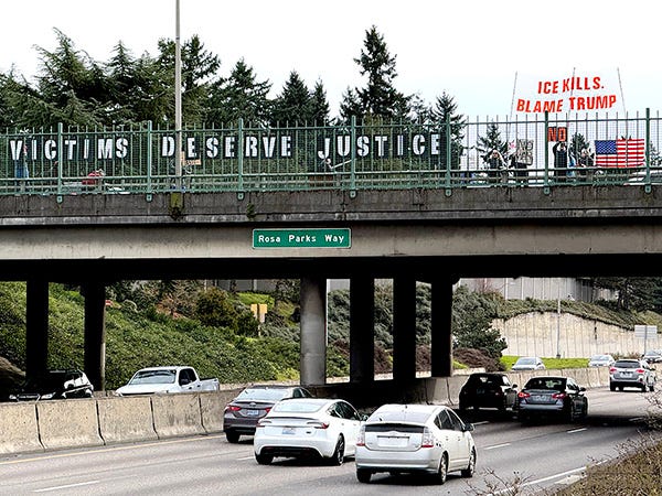 Rosa Parks & I-5 Overpass on 28 February 2026 in Portland, Oregon.