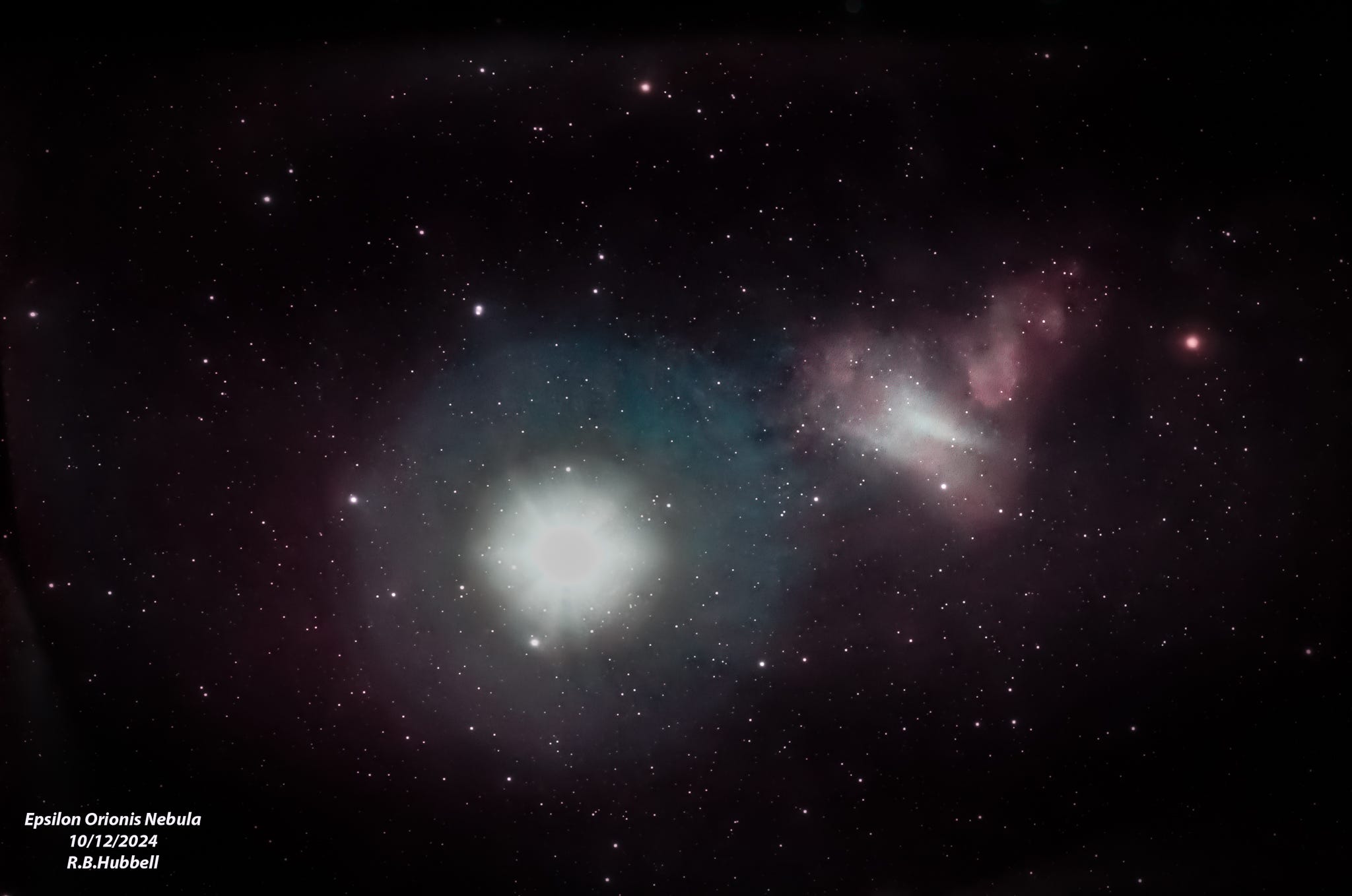 The nebulosity to the upper right of the star is a small portion of a much larger dust cloud near the star. My image captured only a small bit of the cloud because of the short exposure necessary to capture the bright Epsilon Orionis.