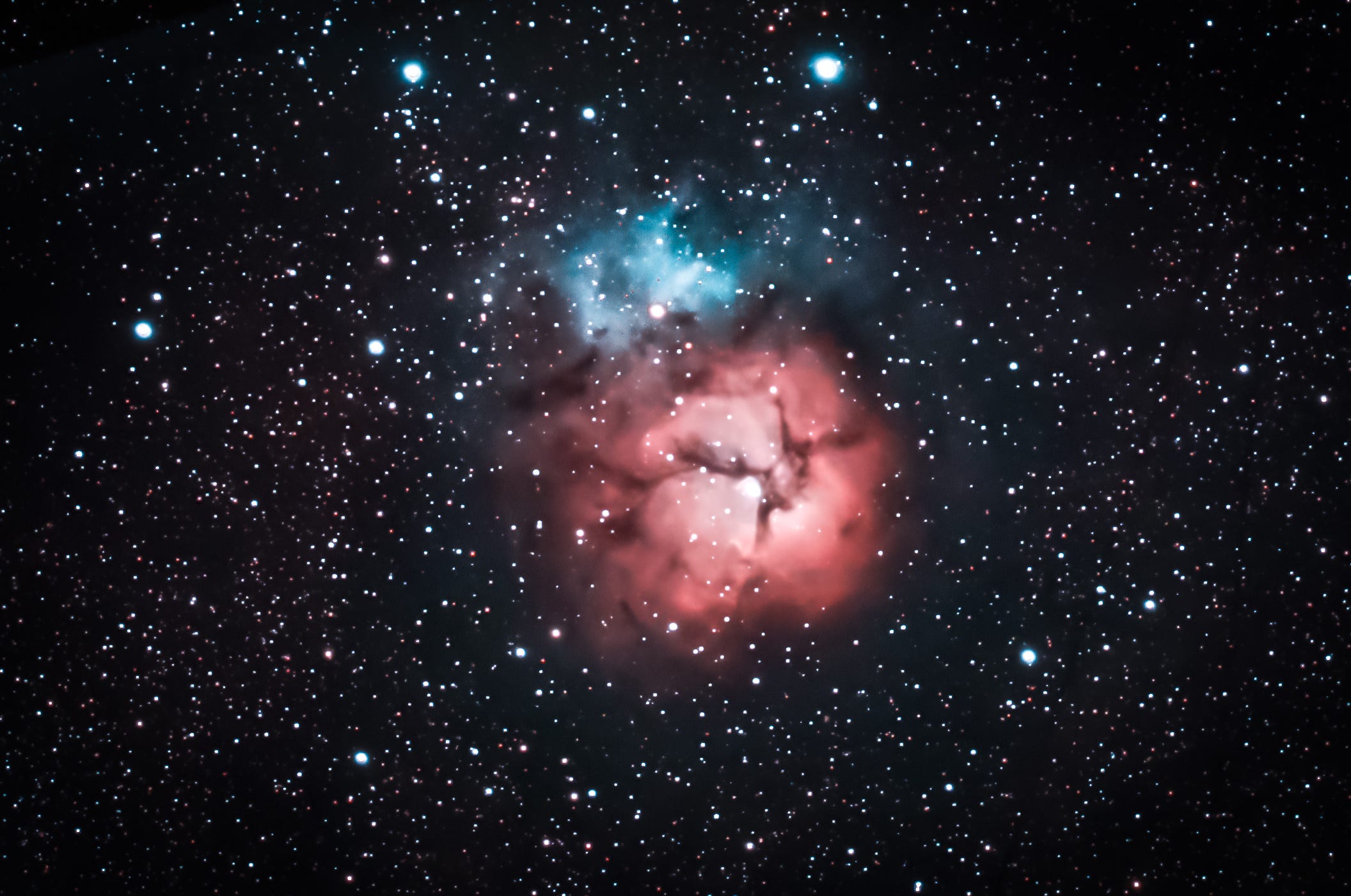 Once again, I present a comparison between a photo taken by the newly commissioned Vera C. Rubin Observatory (first) and one taken by me (second), this time of the Trifid Nebula.