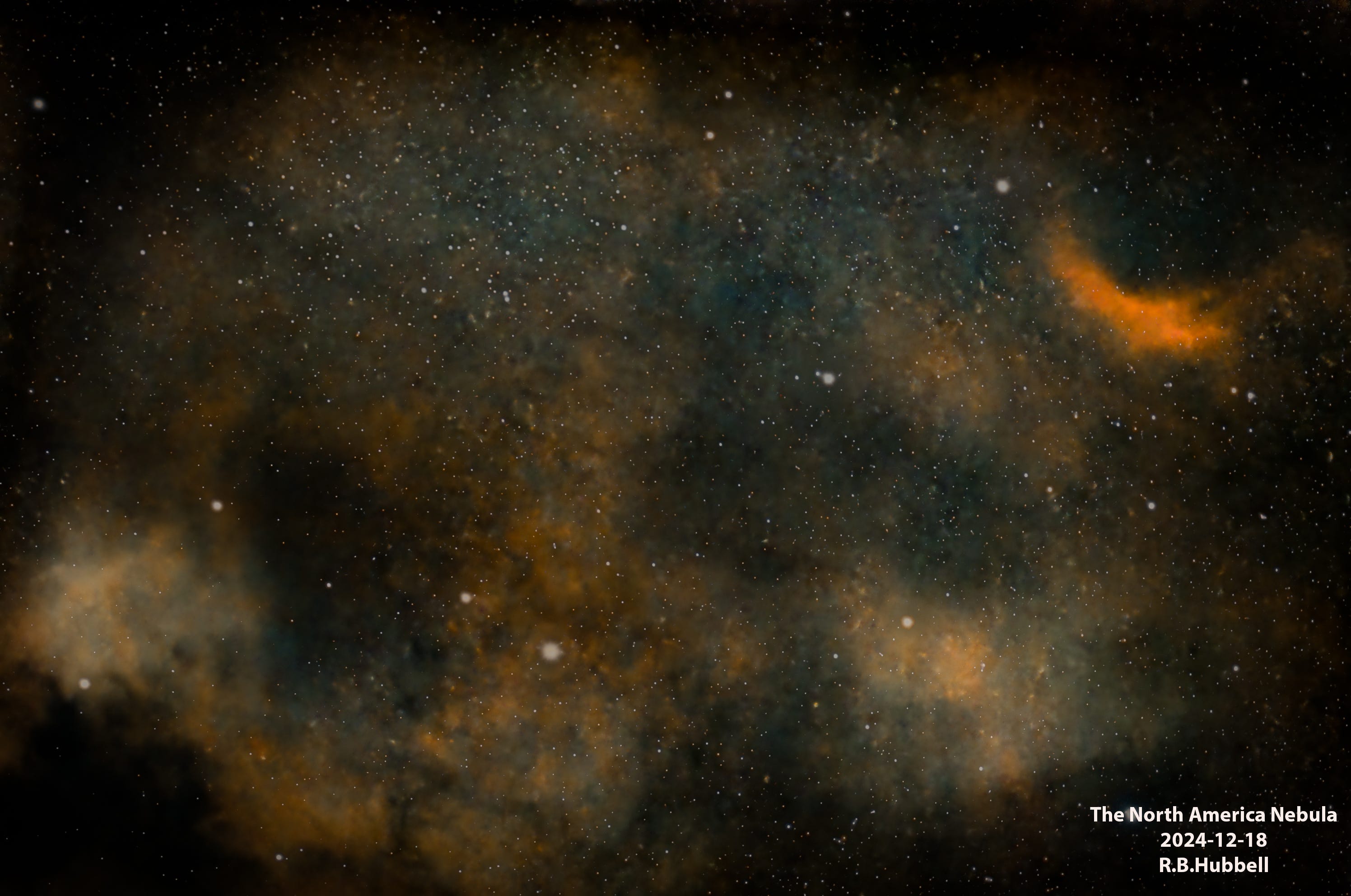 On Wednesday evening, I pointed my telescope at the North America Nebula, which is about three times larger than the field of view of my telescope. So, the image below shows only about one-third of the nebula. While almost everything in deep space is interesting, I chose a section of the nebula that is relatively unremarkable. Ah, well! Next time I will focus on the edges of the nebula—which is where the interstellar action is!
