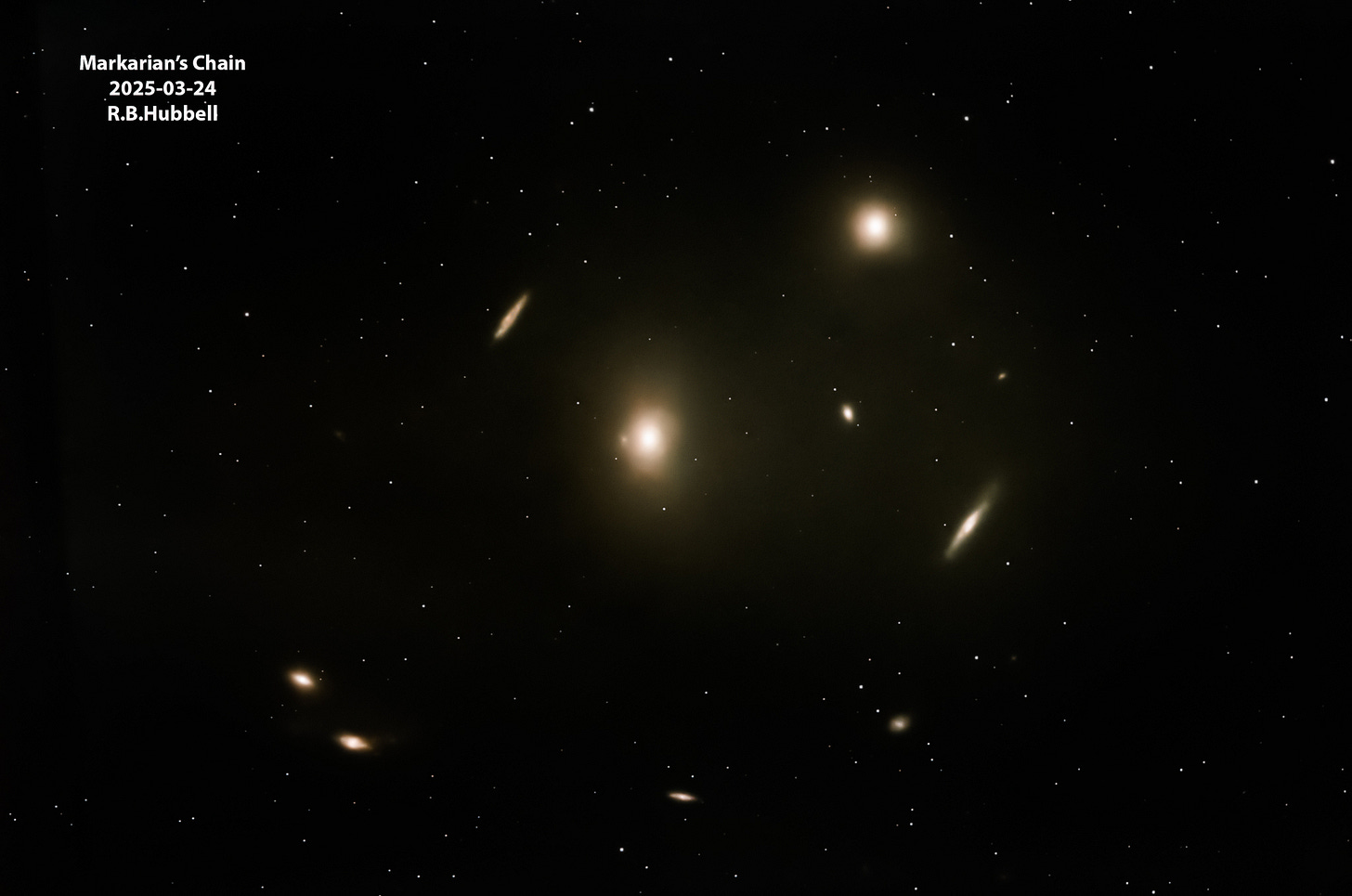 Markarian’s Chain is a group of galaxies included in the Virgo Cluster. They range in distance from 50 to 60 million light years from Earth.