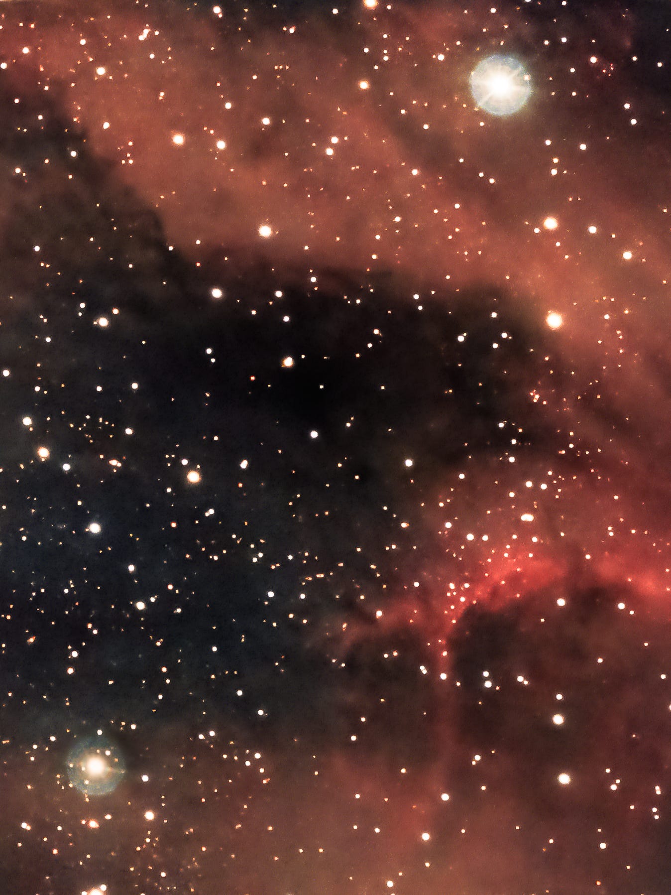 The Pelican Nebula. This photo captures a small portion of a massive nebula located 1,800 light years from Earth. The nebula is a star-forming region that is 30 light-years wide. The photo was taken on July 17, 2024, in Los Angeles. Exposure = approximately one hour. The photo is awkwardly composed because I had to aggressively crop the edges due to frame rotation (caused by the low altitude of the nebula and the rotation of the Earth).