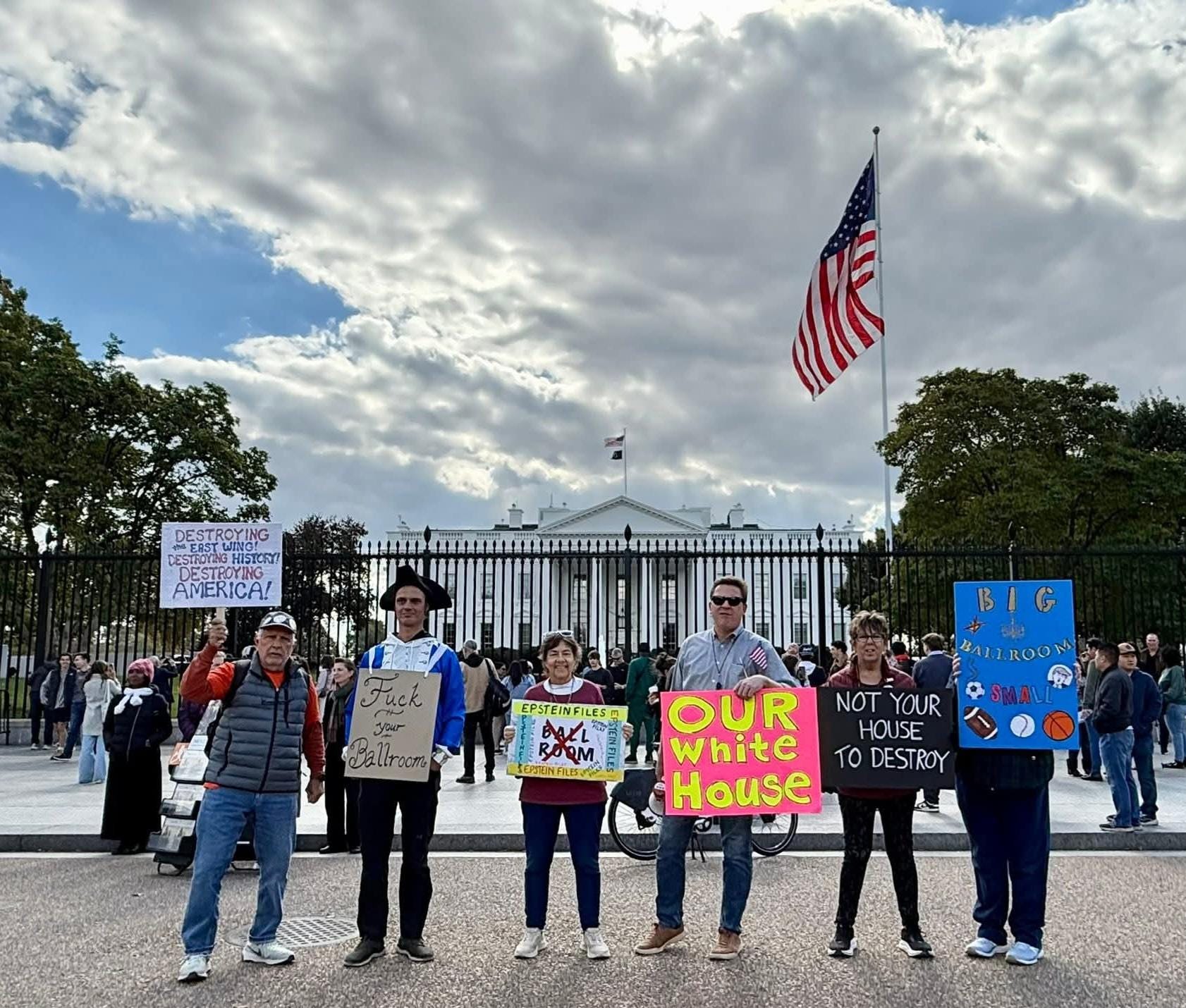 Washington, D.C., from reader Susan D: I gathered friends from several local Indivisible groups, and we headed to the White House today to protest the demolition of the East Wing and the ridiculous ballroom project.