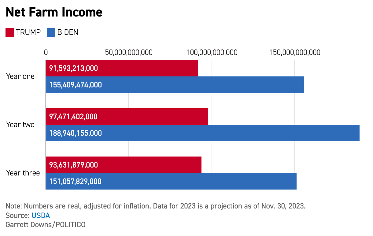 Garret Downs addresses the question of the economic performance of America’s farmers under Biden vs. Trump. See Garrett Downs, Politico, Did Trump or Biden deliver more for farmers? The answer may surprise you.