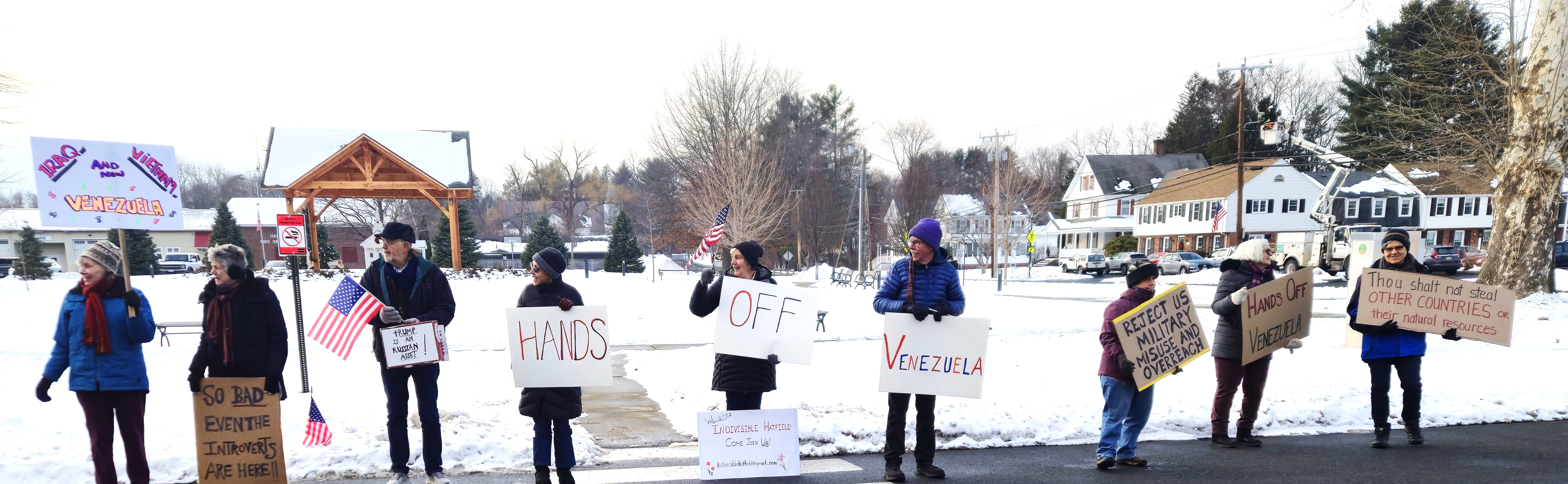 Here we are, ten of us in the center of Hatfield, MA, waving our signs. Cars and trucks honked and waved as they drove by.