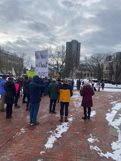 Bangor, ME celebrated its one-year anniversary of its Tuesday protests in front of the Federal Building. Today is actually our 53rd week out there. It was a chilly and damp today, but in total we had about 38 protesters. Some new faces too!!