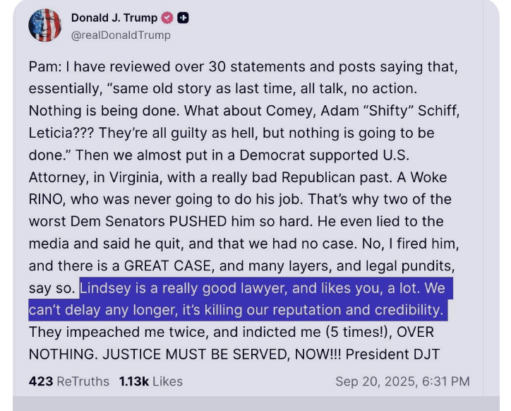 And who among us has not mistakenly sent a private communication to a “reply to all” list that contains several million people? Trump did so on Saturday by publicly posting a Truth Social comment that was apparently meant as a private communication to Attorney General Pam Bondi. Here is a screenshot of the now-deleted post: