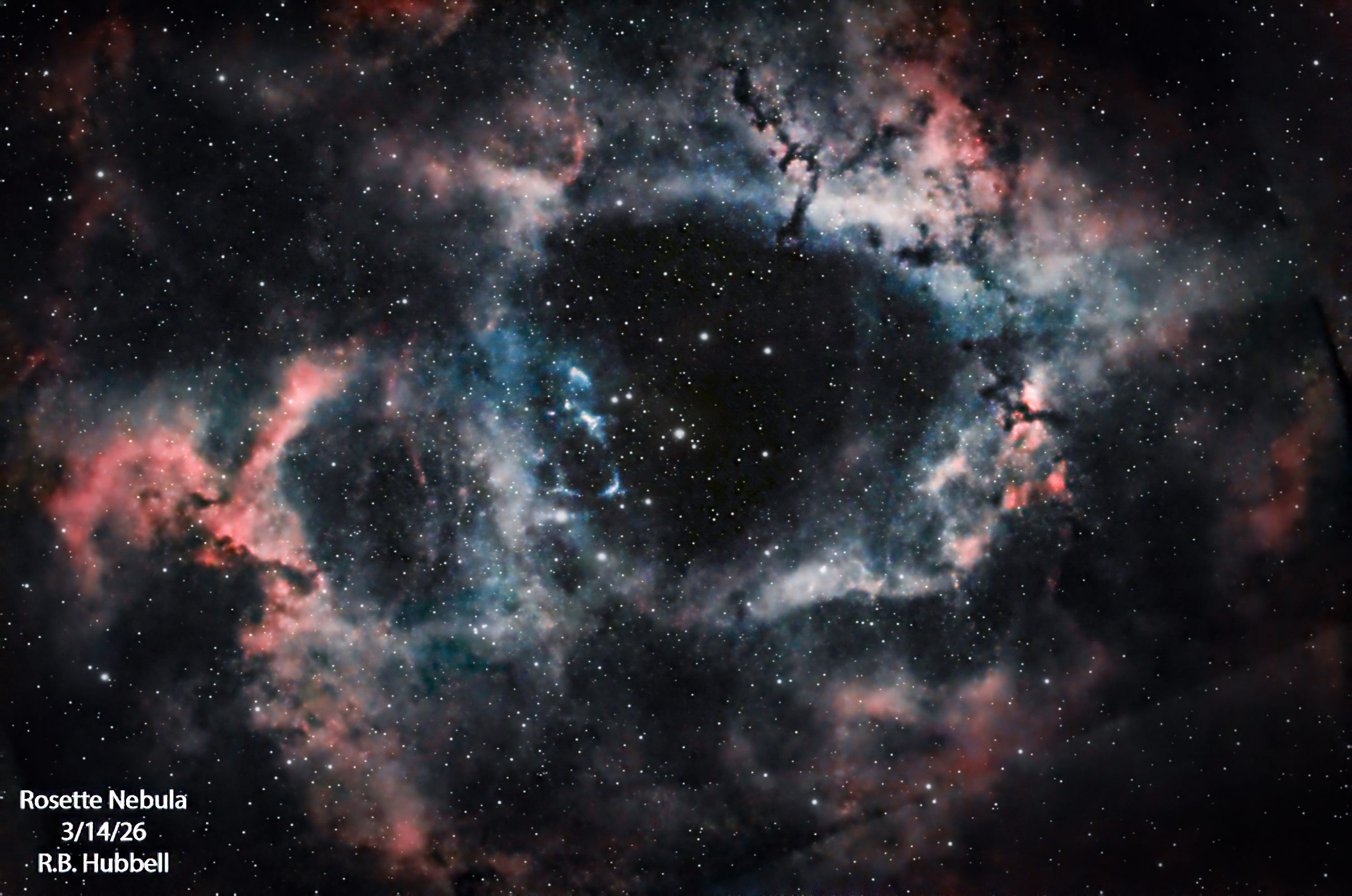 I was able to find time this evening to set up my telescope. I photographed one of my favorite objects, the Rosette Nebula. The Rosette Nebula is a vast cloud of gas and dust located roughly 5,000 light-years away and is about 130 light-years across — large enough that, if visible to the naked eye, it would appear six times the diameter of the full Moon. The central cavity is created by stellar winds from young, hot stars at the center of the nebula.