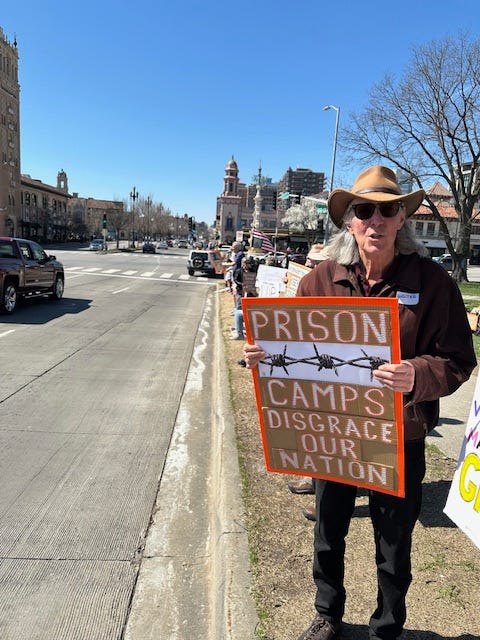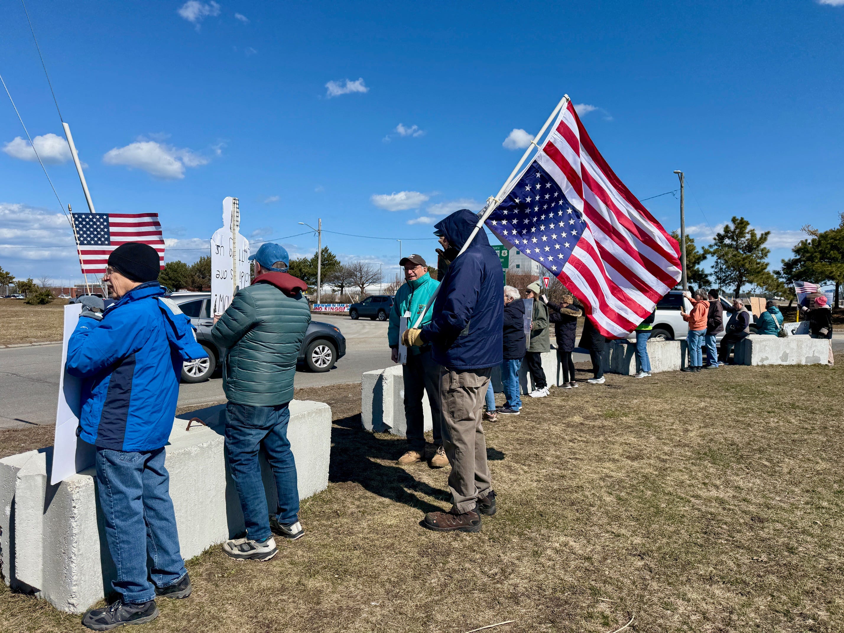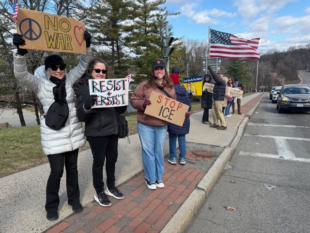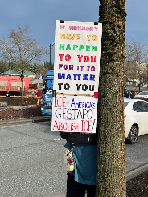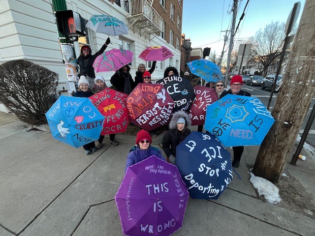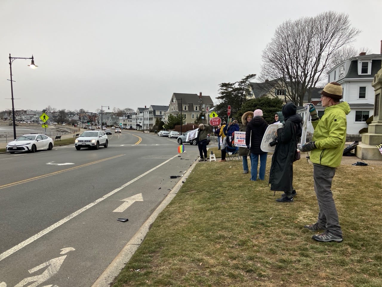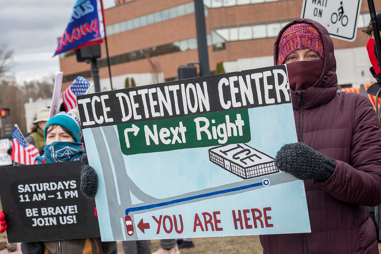 We stood with about 40 protesters on a Saturday (they are there every day now) on a busy intersection just down the road from the ICE detention center in Burlington, MA.