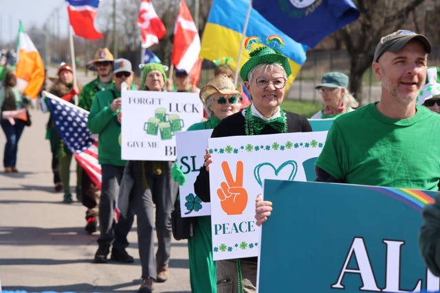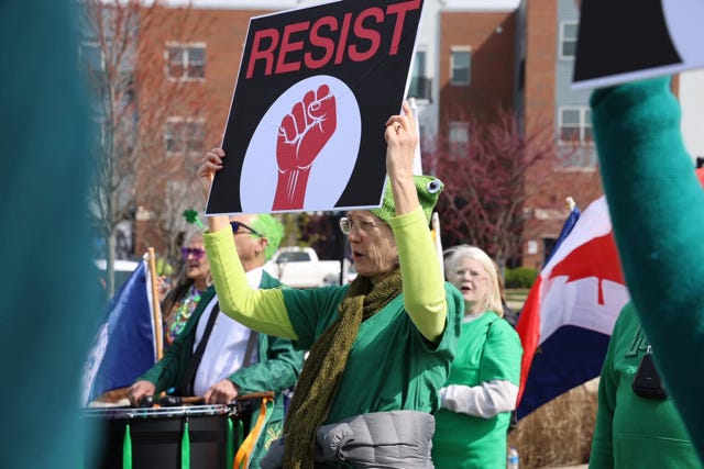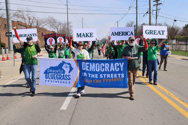 Photos Lexington KY Parade. Peaceful Bluegrass Resistance pro democracy group protesting in the Lexington, KY Saint Patrick’s day Parade 3/14/26.