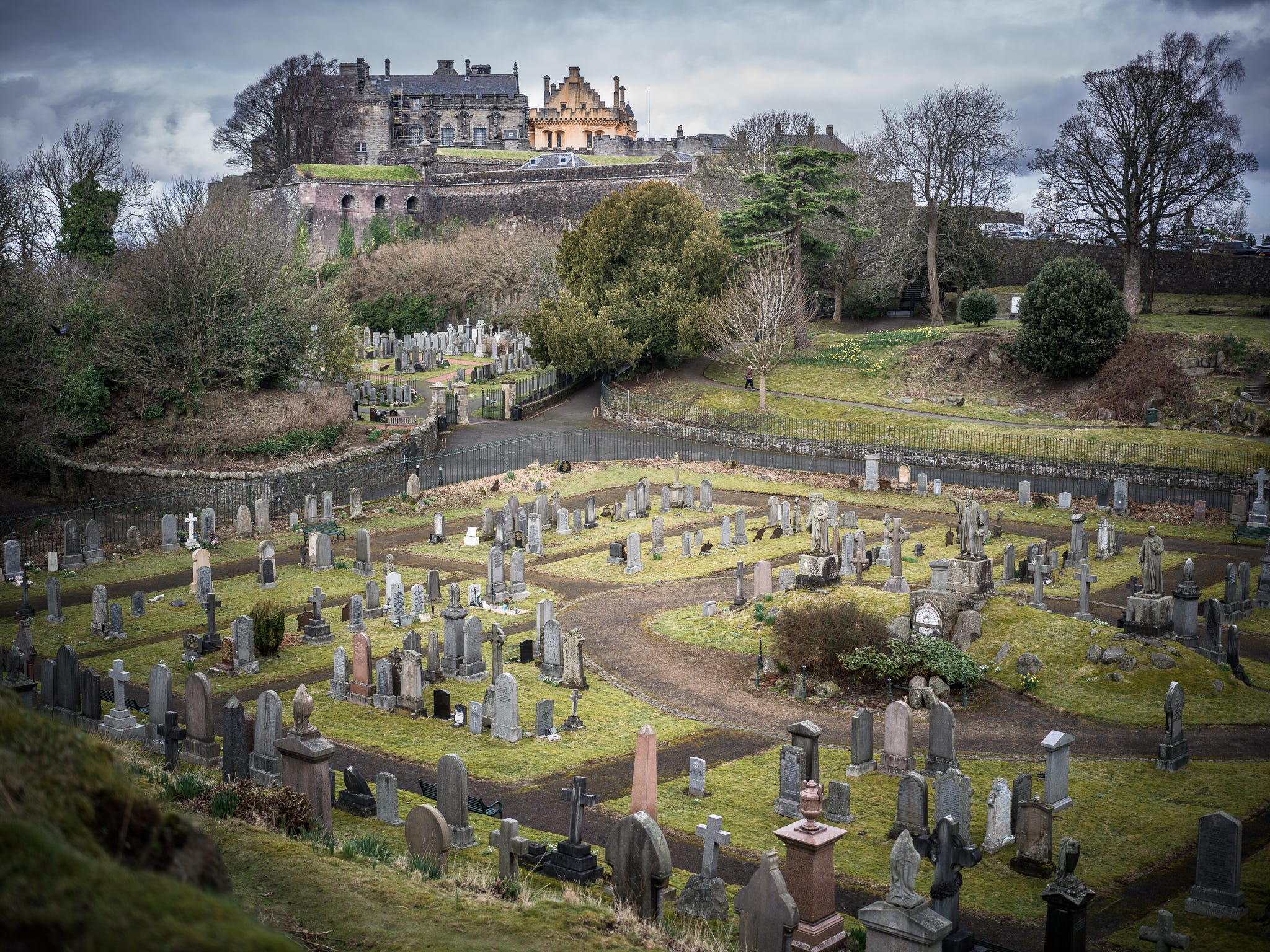 Stirling Castle (circa 1110) in Scotland, overlooking Old Town Cemetery (circa 1500).