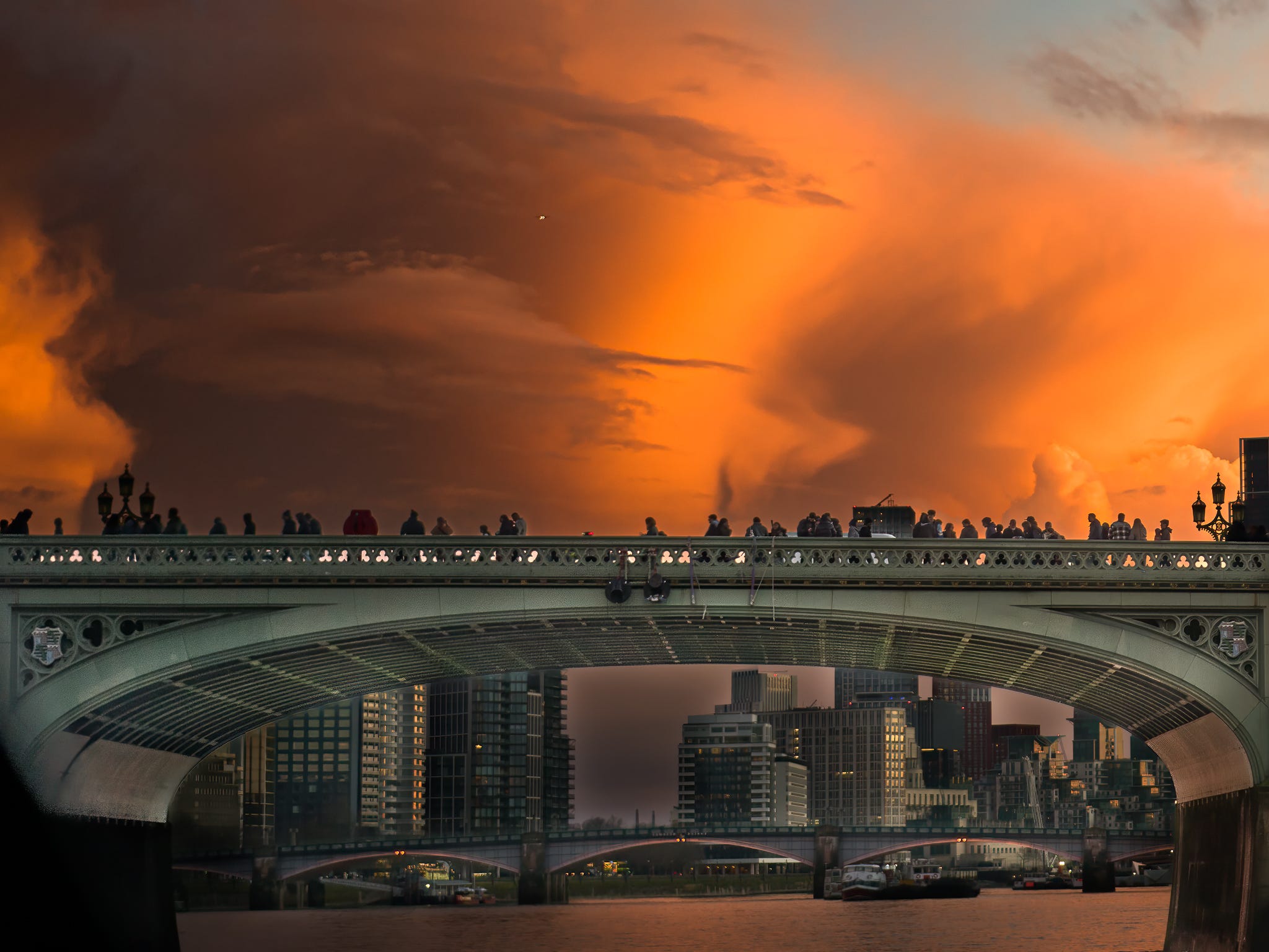 Londoners walking home from work in the early evening. Westminster Bridge on the River Thames.