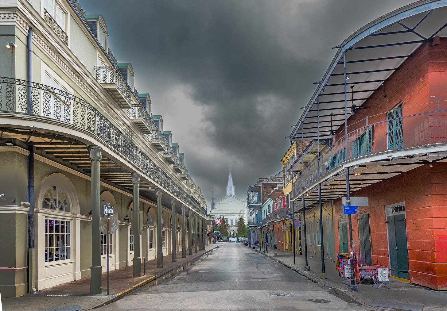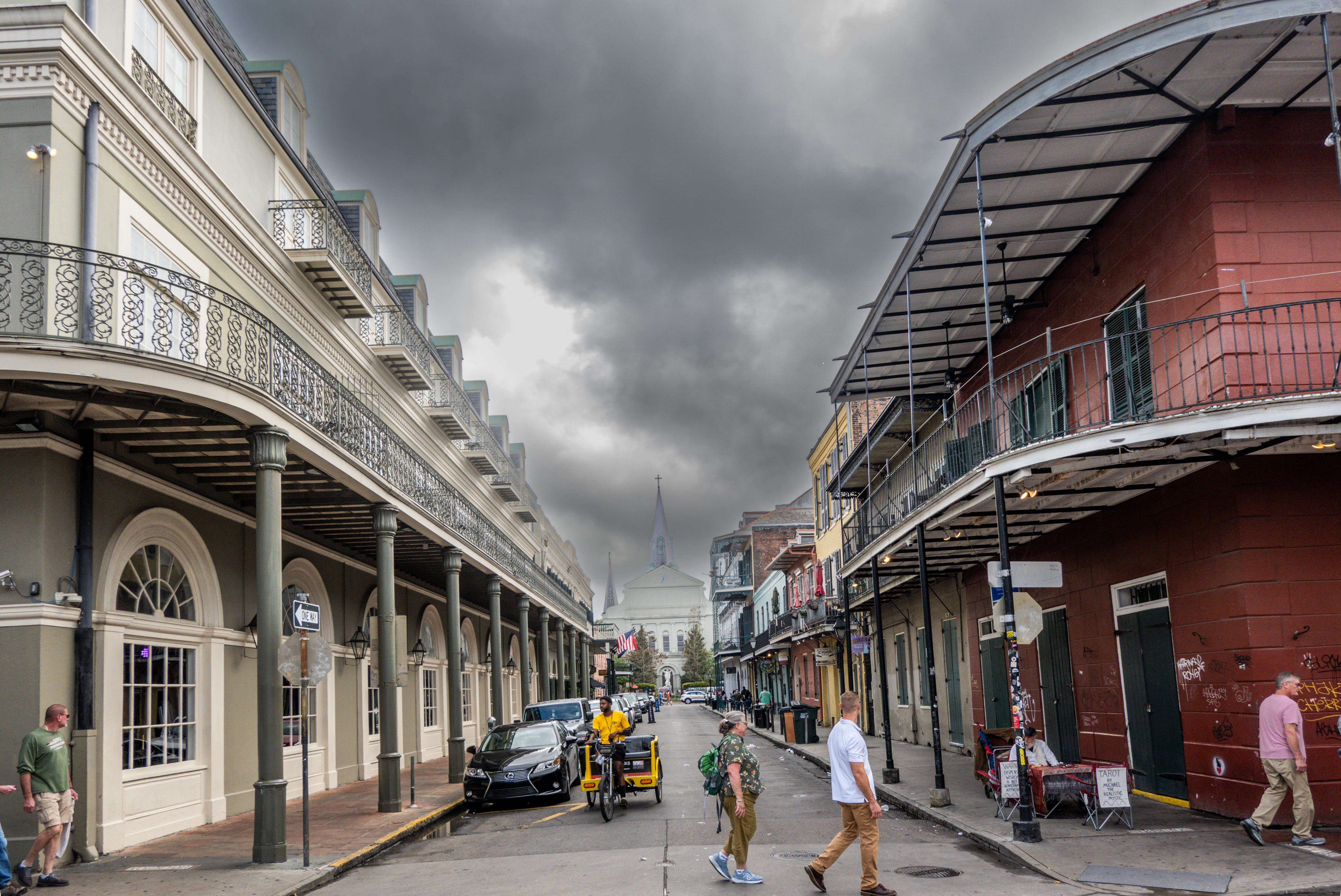 The first photo below is an image I captured with my Sony Alpha 7iiia with 20-70mm lens. The photo was taken from the intersection of Bourbon Street and Orleans Avenue in the French Quarter of New Orleans. St. Louis Cathedral is located at the vanishing point in the photo.