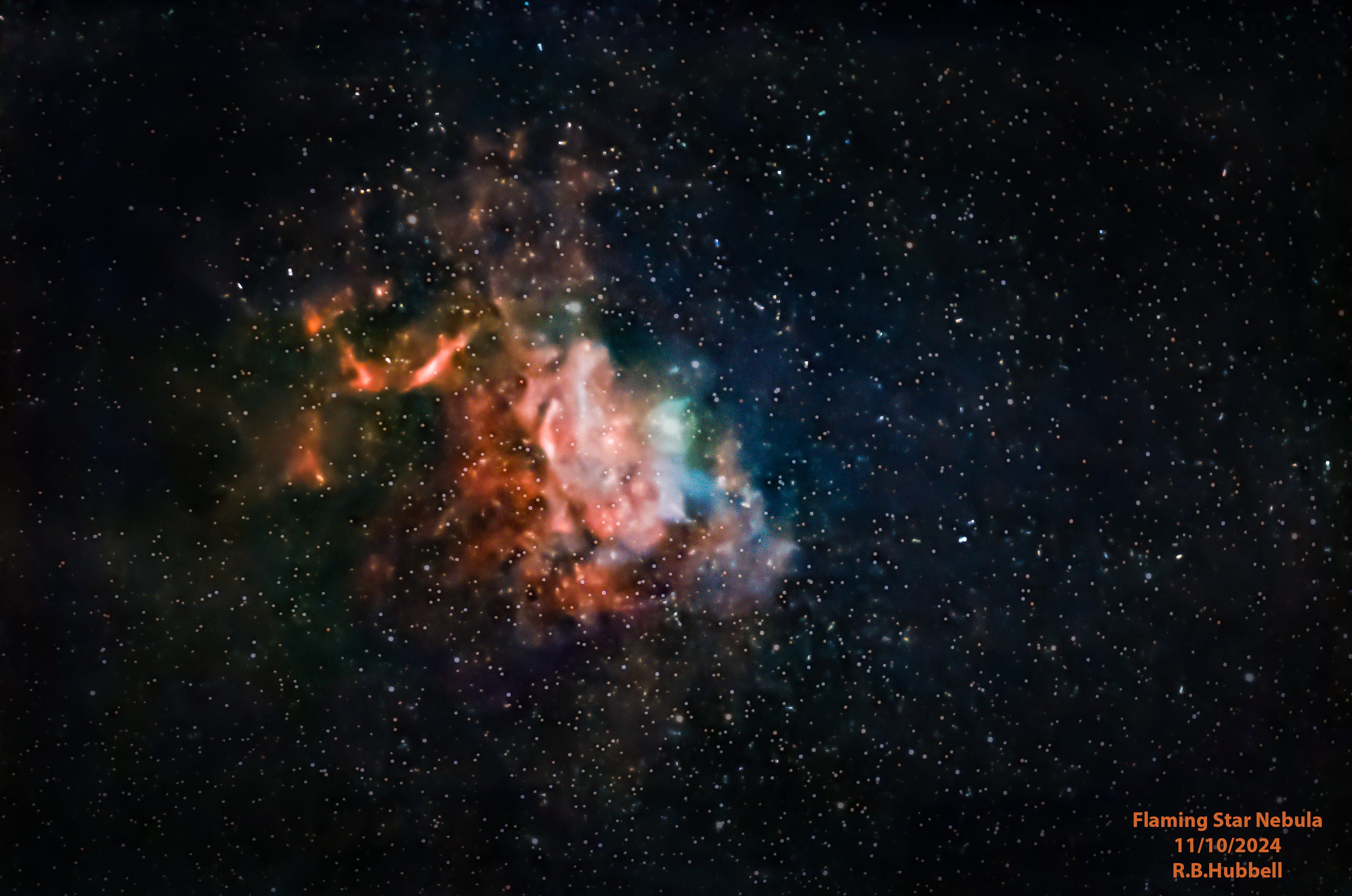 Below is an image of the Flaming Star Nebula. The image was captured during high winds in the LA basin over the weekend. It appears to me that some of the stars in the background are “smeared” due to atmospheric turbulence. The computer processing software used to stack images should have “averaged out” the fuzziness of the background stars. Not quite sure what happened. But I will make another attempt soon.