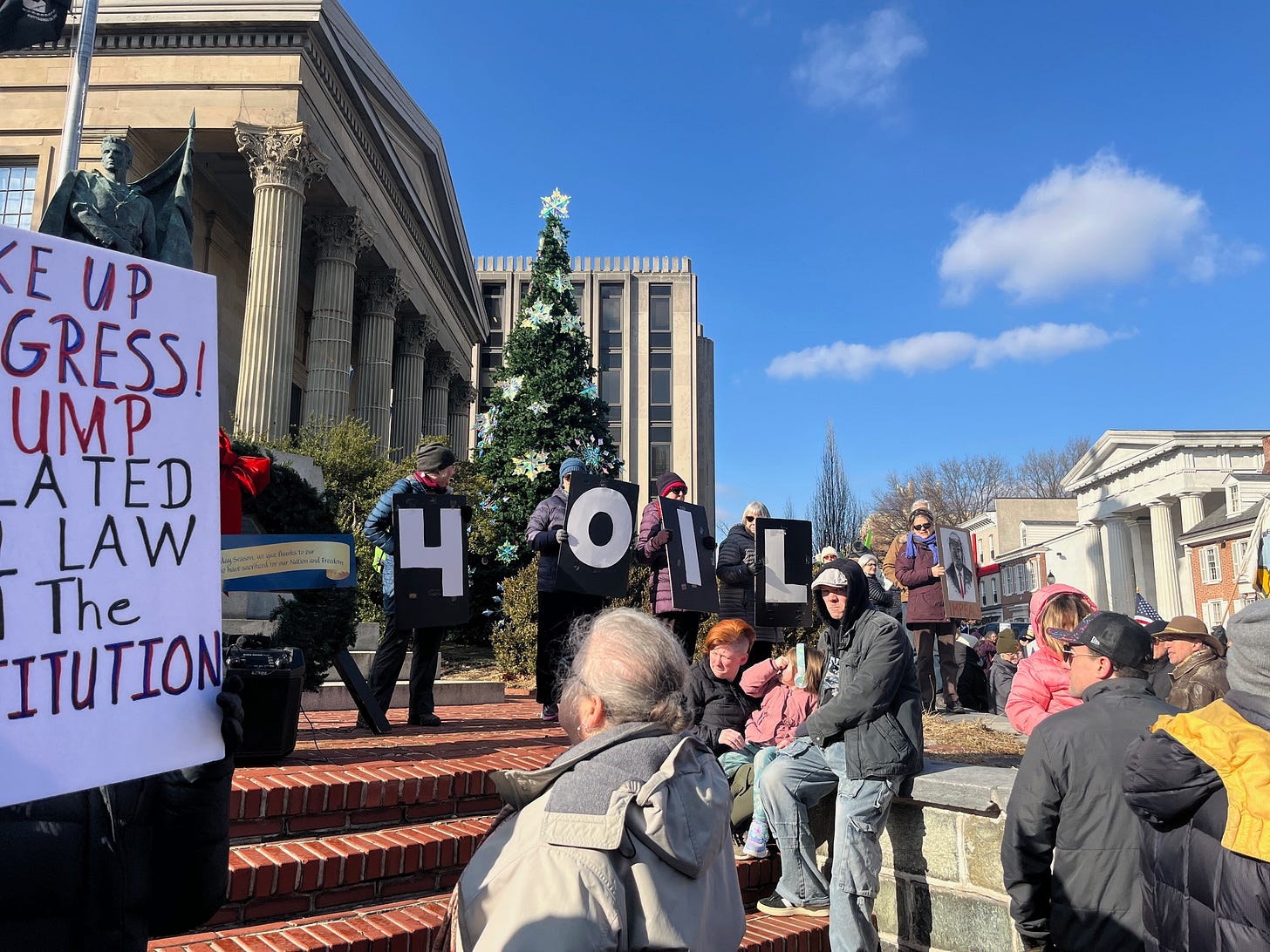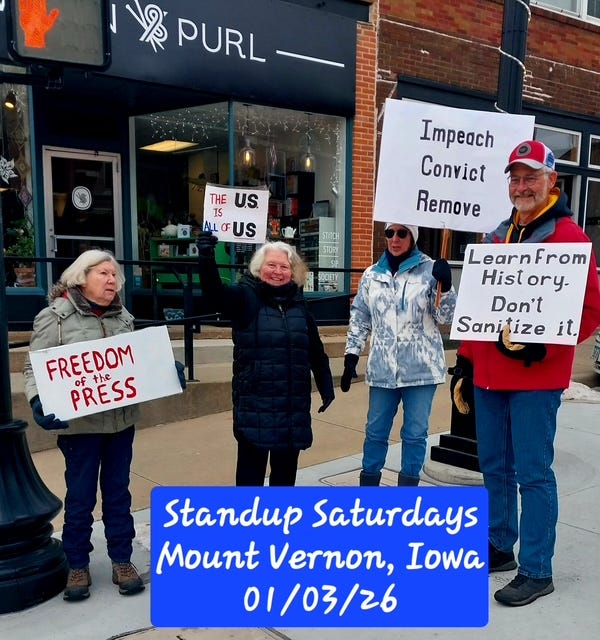Mount Vernon, Iowa. Yesterday was the first of our weekly protests as we objected to the corruption, cruelty, and illegality of the current administration. We are a town of about 4000. Yesterday, 24 people came out in 29°F weather. As you can imagine, we are hoping for more each week.