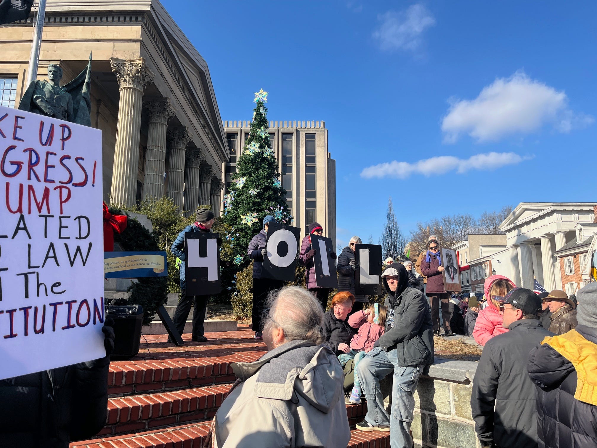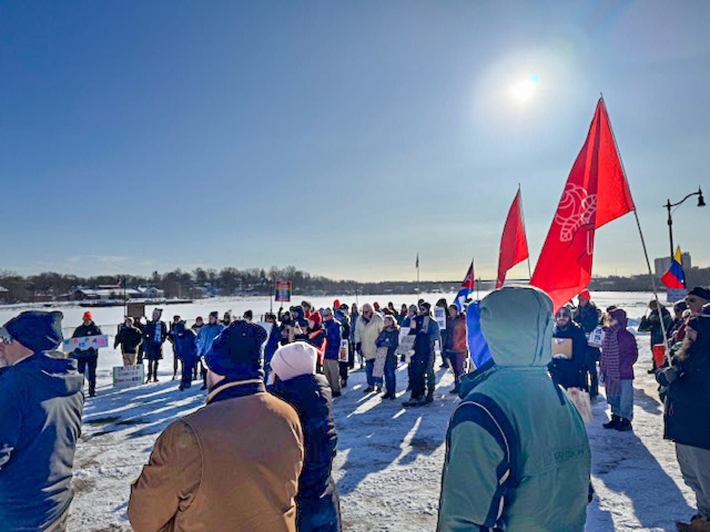 Bangor, ME. Not all are pictured, but about 100 to 150 people gathered in 14-degree temps (luckily it was a bright sunny day and there was no wind) to protest Trump’s illegal occupation of Venezuela.