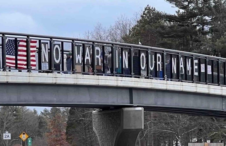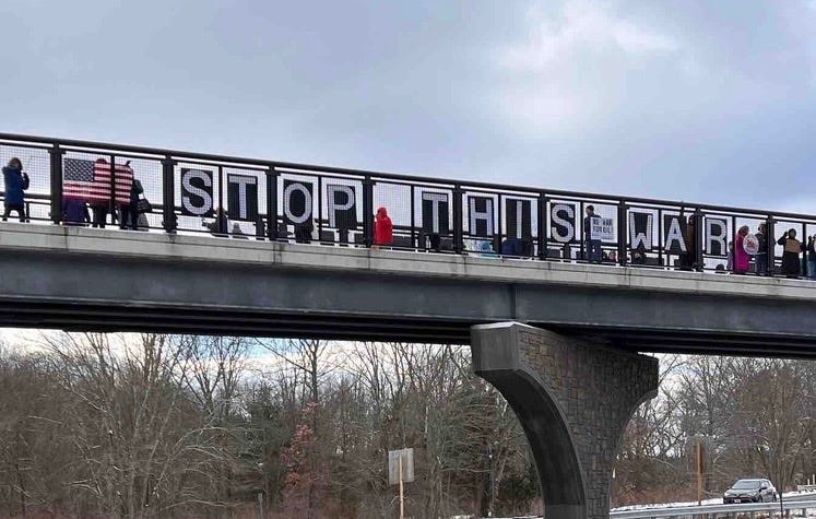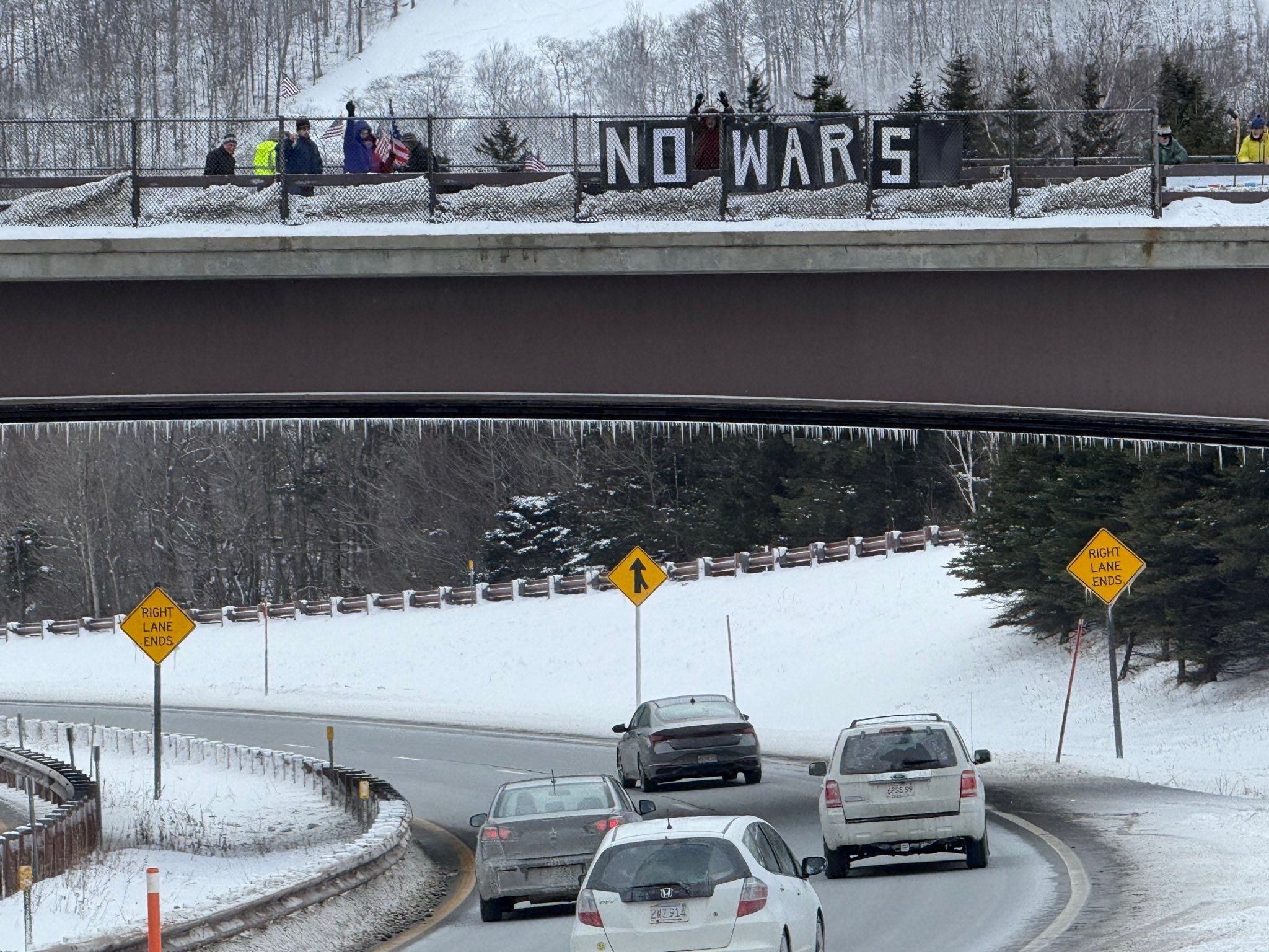 This afternoon we were able to do a "pop up" visibility message on the northernmost I-93 overpass in Franconia Notch. Despite the 10 degrees (or below) temps, over a dozen people participated as we displayed our "NO WARS" messages to northbound and southbound drivers.