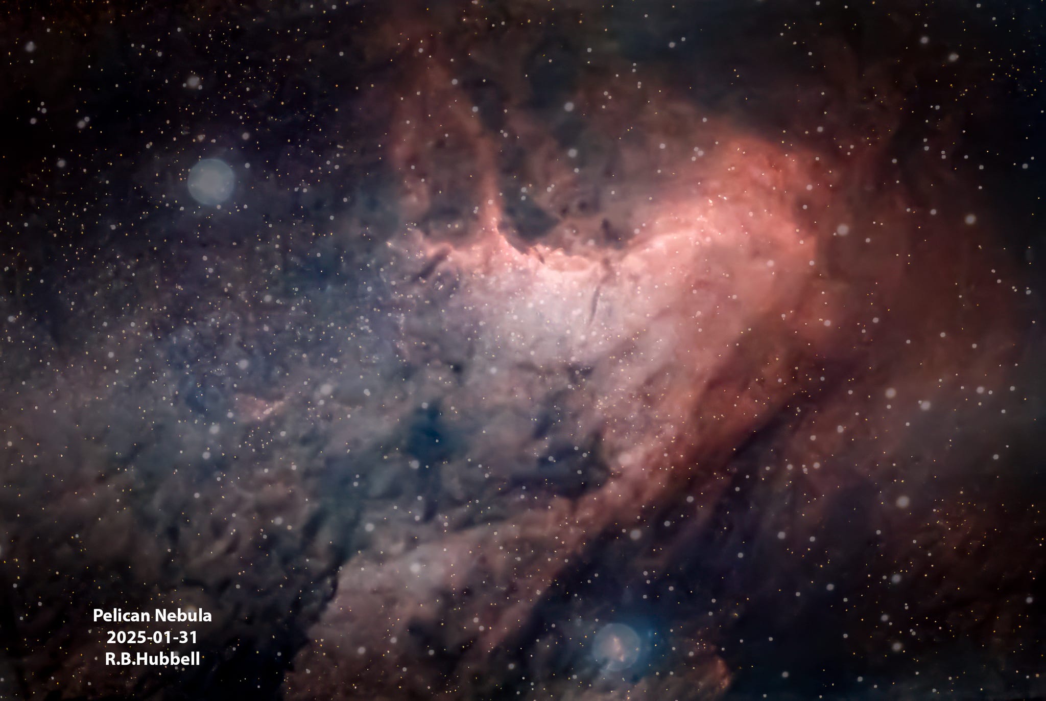 The Pelican Nebula is a star-forming region of dense molecular clouds. It is located about 1,800 light-years from Earth.