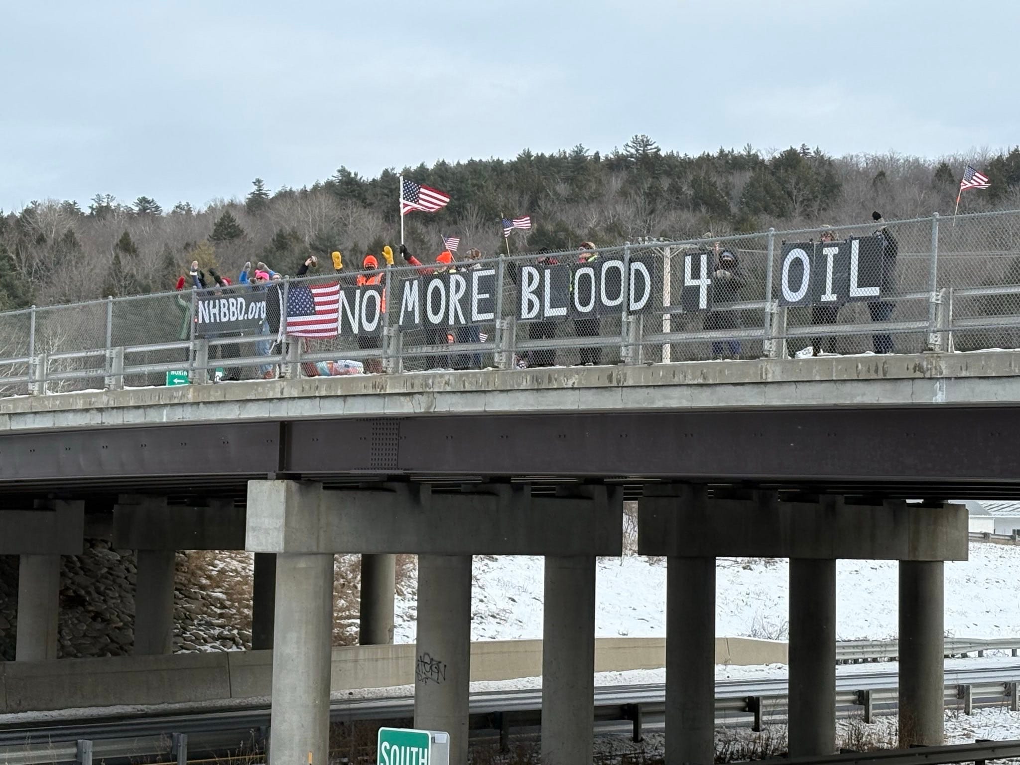 1/4/2026, NH Bridge Brigade. We’ve been here above I-89 in Enfield, NH every Sunday for several weeks. In spite of the 20-degree weather and the breeze (see flag), we had a record turnout of 7 participants.