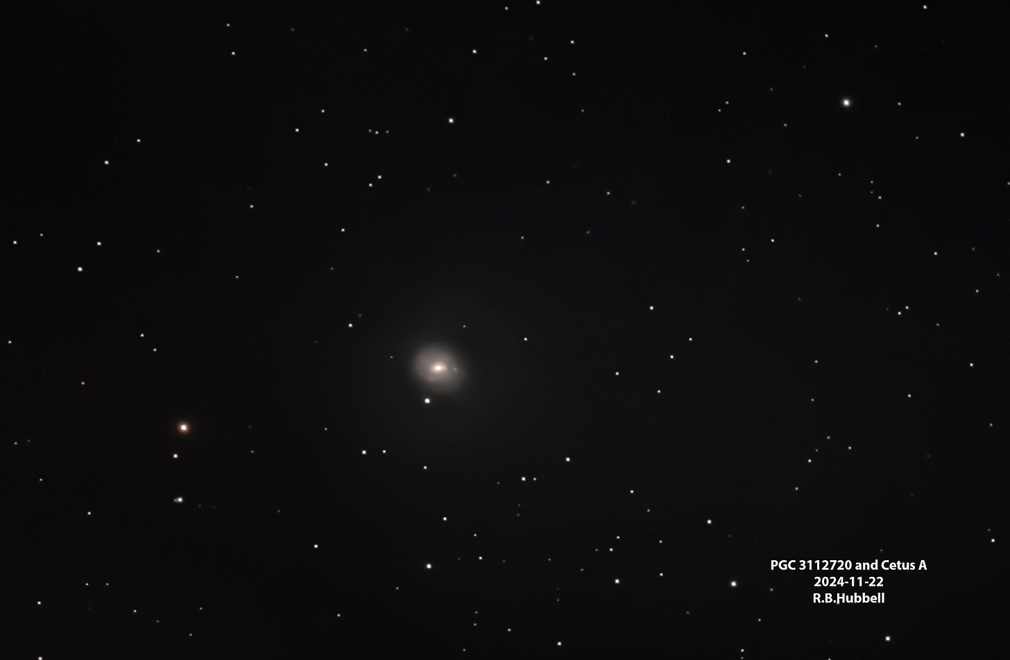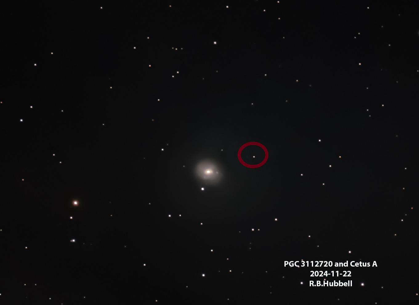 To the upper right of Cetus A (at 2:00 o’clock) is a tiny dot, which is a galaxy designated as PGC 3112720. PGC 3112720 is located two billion light-years from the Milky Way. Two billion light-years! And it is moving away from us at 14% of the speed of light!