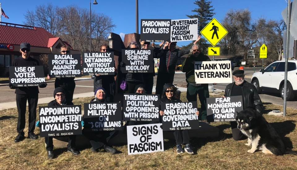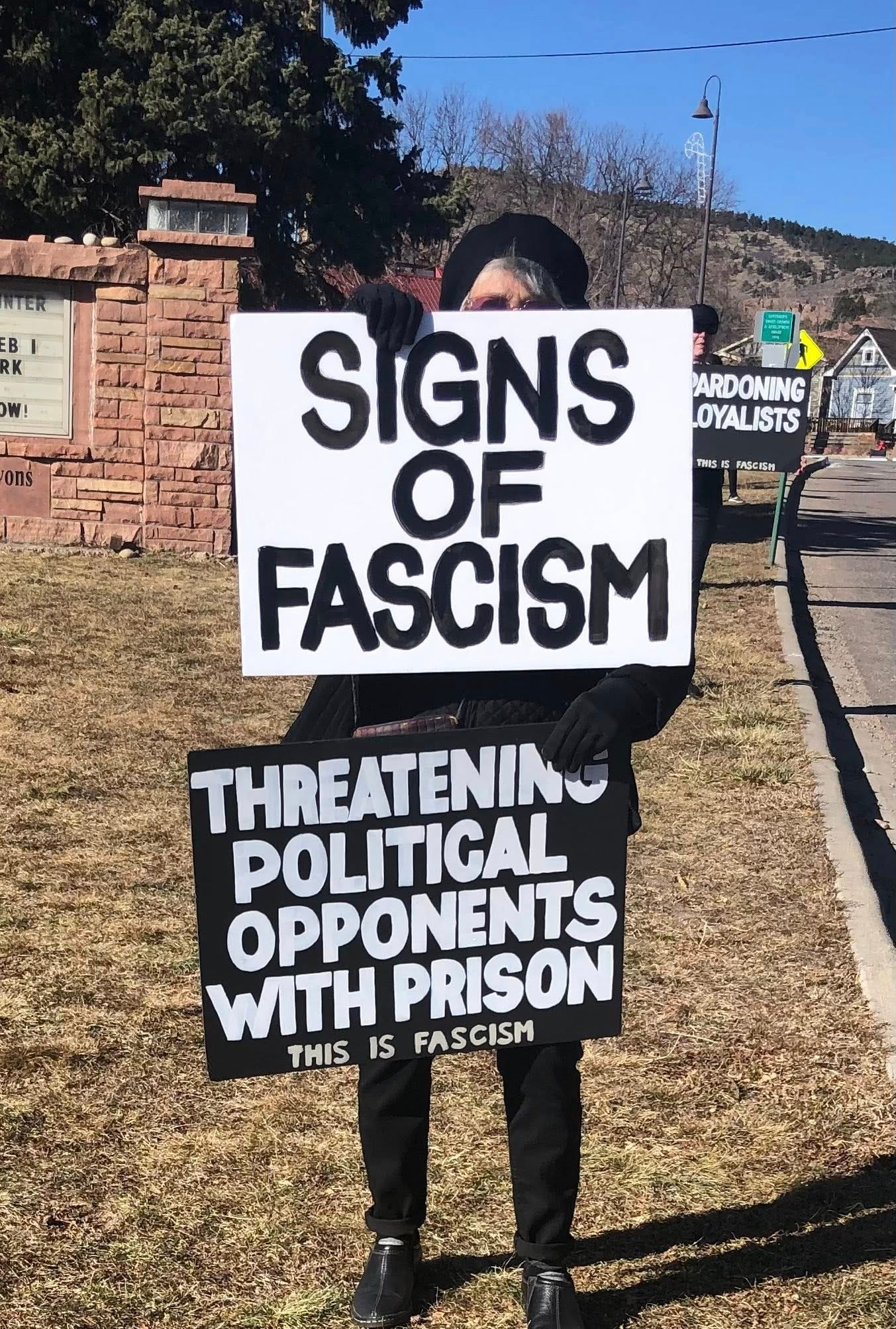 Attached is a photo of our “Signs of Fascism” local group, Lyons Neighbors 4 Democracy (modeled after the brilliant Sequim, WA, street political theater), which we put up yesterday to commemorate the Jan. 6 insurrection.