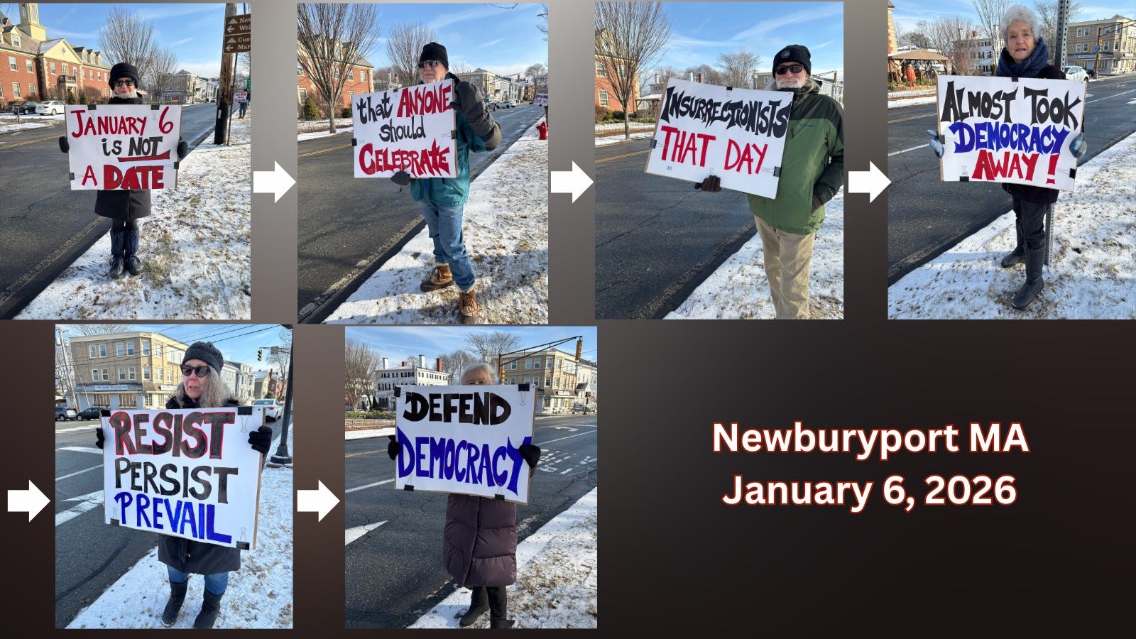 Our Newburyport Democratic City Committee protest committee had a last-minute January 6th protest in the style of the old Burma Shave ads, which most people may not remember. Each protestor was standing a distance apart, so that drivers could read the message. One of our group members took a picture of each of us and put them together in the attached photo.